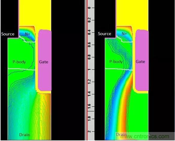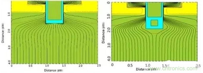 圖7:Trench(左)和SGT屏蔽柵電流線分布圖