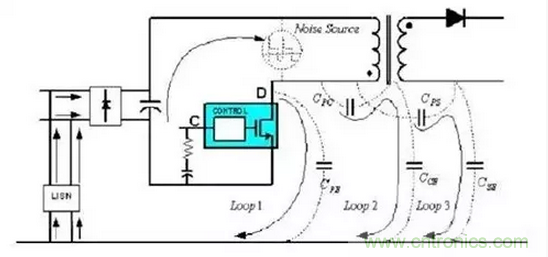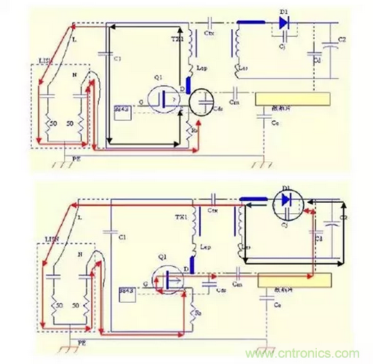 如圖:一般有二種模式:L,N差模成分,以及通過(guò)PE地回路的共模成分。有些頻率是差共模均有。