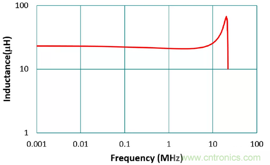 電感器之電感值在電路設計時為最重要的基本參數(shù),但必須看在工作頻率下此電感值是否穩(wěn)定。電感的標稱值通常是在沒有外加直流偏置的條件下,以100 kHz 或1 MHz 所量得。且為確保大量自動化生產(chǎn)的可能性,電感之容差值(tolerance)通常是 ±20%(M)與±30%(N)居多。圖3為利用表量測 電感220M 之電感-頻率特性圖,如圖所示,在5 MHz 之前電感值的曲線較為平坦,電感值幾乎可視為常數(shù)。在高頻段因寄生電容與電感所產(chǎn)生的諧振,電感值會上升,此諧振頻率稱為自我諧振頻率,通常需遠高于工作頻率。