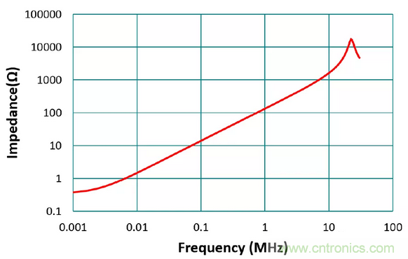 如圖4,從阻抗圖也可以看出電感在不同頻率下的表現(xiàn)。電感的阻抗約與頻率成正比(Z=2πfL),因此頻率愈高,電抗會比交流電阻大很多,所以阻抗表現(xiàn)就如同純電感(相位為90?)。而再往高頻,由于寄生電容效應,可以看到阻抗的自我諧振頻率點,過了此點阻抗下降呈現(xiàn)電容性,且相位逐漸轉(zhuǎn)為-90 ?。