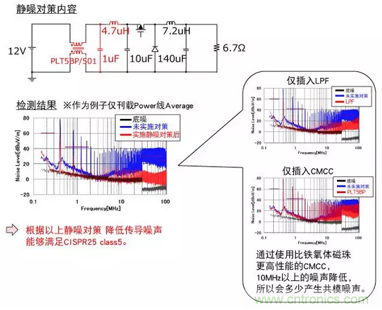 【導(dǎo)讀】汽車中搭載各種各樣的電子設(shè)備。為了產(chǎn)生電子設(shè)備具備各自需要的電壓,而致力于電源電路的研發(fā)。為使電源電路具有效率化,使用開關(guān)方式的產(chǎn)品,但這也是產(chǎn)生噪聲的問題根源。在此,介紹車載設(shè)備電源電路(DC-DC轉(zhuǎn)換器)的靜噪對策。在此介紹的對策內(nèi)容和對策元件不僅適用于汽車還適用于工業(yè)用設(shè)備等。