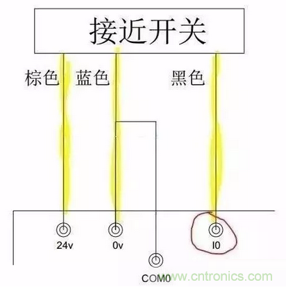 如圖三所示,這是PLC 的實(shí)際接線,黃色熒光筆標(biāo)識(shí)的是接近開關(guān)的三根接線,棕色和藍(lán)色分別接到PLC 的24V和0V上,黑色接到I0上。當(dāng)有物體到達(dá)接近開關(guān)的感應(yīng)距離時(shí),PLC的I0便會(huì)有輸入,我們?cè)诔绦蚶锞涂梢宰鎏幚?。需要注意的是,圖中0V和COM0短接,因此,這種接法適合PNP型的接近開關(guān)。而NPN型的接近開關(guān)按此接法,是不會(huì)有任何信號(hào)的。接近開關(guān)的接線只和NPN,PNP類型有關(guān)和感性 容性無(wú)任何關(guān)系。