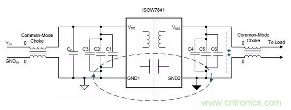 上圖是ISOW7841設計,使用扼流圈來降低共模電流以及返回路徑環(huán)路面積,間接減少輻射發(fā)射。 共模扼流圈可插入輸入和輸出電源或連接到系統(tǒng)的任何長電纜上。