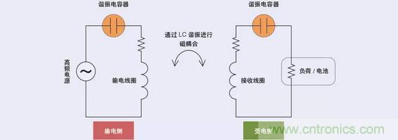 磁共振式是在輸電側與受電側分別插入電容器,形成LC諧振電路,并使輸電側與受電側諧振頻率一致,從而進行電力傳輸?shù)姆绞?。其特點在于即使線圈間的距離多少會出現(xiàn)擴大,或偏離中心位置的情況等在耦合系數(shù)較低的狀態(tài)下也能實現(xiàn)高傳輸效率。其基本原理如圖1所示。