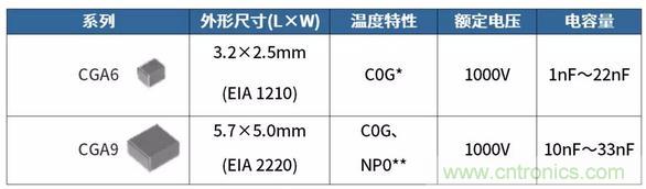 TDK提供車載等級及CGA系列的中耐壓MLCC(額定電壓100~630V)、高耐壓MLCC(額定電壓1000V以上)等各類MLCC。其中,額定電壓為1000V、溫度特性為C0G特性/NP0特性、電容量為1nF~33nF的產(chǎn)品擁有以下類型。除了磁共振式無線充電共振電容器之外,在時間常數(shù)電路、濾波器電路、振蕩電路等在有高精度的要求時,需要實現(xiàn)小型化和SMT化的情況下可以用于替換薄膜電容。同時,為了進一步提高可靠性,對于基板彎曲導致的元件體開裂、熱沖擊導致的焊錫開裂以及振動等外部環(huán)境因素具有較強耐受性的金屬支架電容及樹脂電極品系列也一應俱全。