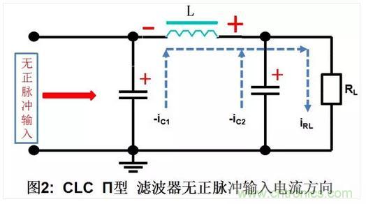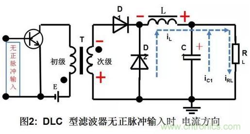b. 輸入正脈沖消失,負(fù)載RL的電流由兩路提供,一路是C2放電提供的電流為-ic2,,另一路是由電感L儲存的磁能轉(zhuǎn)換成電能,并與C1上的電壓串聯(lián)后提供-ic1。負(fù)載RL中的電流等于兩個(gè)電容器放電電流的和,即IL= -(ic2+ic1)
