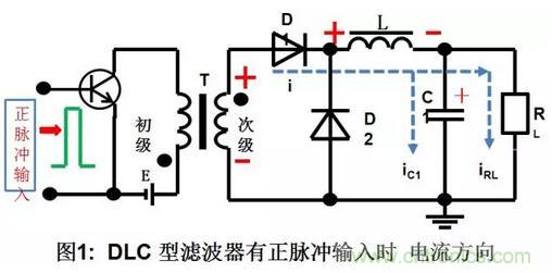 a.輸入正脈沖時(shí),先給C1充電,充電電流為ic1,迅速充到脈沖的峰值電壓Vi,同時(shí)電感器L中也有線性增長的電流,并在L中儲存了磁能,隨著電流的增長,儲存的磁能越來越多,電容器C2通過電感L也充上了電壓,充電電流為ic2,C2和C1上的電壓基本相等,負(fù)載RL中的電流IRL也是由輸入脈沖供給。