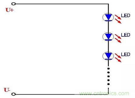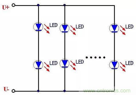這種串聯(lián)連接的方式電路比較簡(jiǎn)單,首尾連接在一起,LED工作時(shí)流過(guò)的電流一致很好,由于LED屬于電流型器件,因此基本可以保證每個(gè)LED的發(fā)光強(qiáng)度一致。采取這種LED連接方式的電路簡(jiǎn)單、連接方便。但是也有一個(gè)致命的缺點(diǎn),那就是當(dāng)其中一個(gè)LED發(fā)生開(kāi)路故障時(shí),將造成整個(gè)LED燈串的熄滅,影響了使用的可靠性,這就需要保證每個(gè)LED的質(zhì)量過(guò)硬,這樣可靠性也就相應(yīng)的提高。