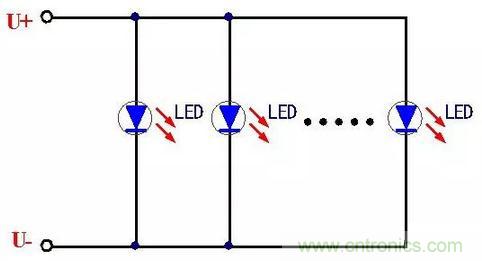 并聯(lián)方式特點(diǎn)是LED首尾并聯(lián)連接,工作時(shí)每個(gè)LED上承受的電壓相等。但是電流不一定相等,即使是同一種型號(hào)、同一種規(guī)格批次的LED也是如此,這是由于生產(chǎn)制造工藝等原因?qū)е?。因此,每個(gè)LED電流分配的不均可能使電流過(guò)大的LED壽命相對(duì)于其他的LED有損下降,久而久之容易燒壞。這種并聯(lián)連接方式電路較為簡(jiǎn)單,但是可靠性也不高,特別LED數(shù)量較多情況下發(fā)生故障可能性更高。