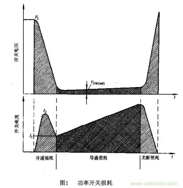 功率開關是典型的開關電源內(nèi)部最主要的兩個損耗源之一。損耗基本上可分為兩部分:導通損耗和開關損耗。導通損耗是當功率器件已被開通,且驅(qū)動和開關波形已經(jīng)穩(wěn)定以后,功率開關處于導通狀態(tài)時的損耗;開關損耗是出現(xiàn)在功率開關被驅(qū)動,進入一個新的工作狀態(tài),驅(qū)動和開關波形處于過渡過程時的損耗。這些階段和它們的波形見圖1。