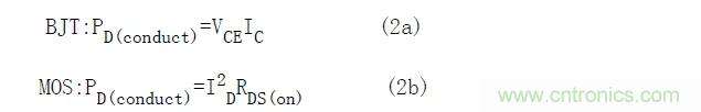 控制這個損耗的典型方法是使功率開關導通期間的電壓降最小。要達到這個目的,設計者必須使開關工作在飽和狀態(tài)。這些條件由式(2a)和式(2b)給出,通過基極或柵極過電流驅(qū)動,確保由外部元器件而不是功率開關本身對集電極或漏極電流進行控制。
