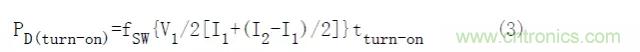 導通損耗可由開關兩端電壓和電流波形乘積測得。這些波形都近似線性,導通期間的功率損耗由式(1)給出。