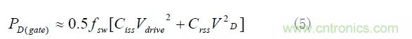 功率MOSFET驅(qū)動效率比雙極型功率晶體管高。MOSFET柵極有兩個與漏源極相連的等效電容,即柵源電容Ciss和漏源電容Crss。MOSFET柵極驅(qū)動的損耗來自于開通MOSFET時輔助電壓對柵極電容的充電,關斷MOSFET時又對地放電。柵極驅(qū)動損耗計算由式(5)給出。