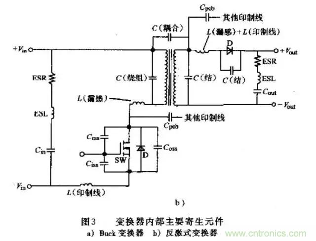 在所有開關電源中,有一些常見的寄生參數(shù),在觀察變換器內(nèi)主要交流節(jié)點的波形時,可以明顯看到它們的影響。有些器件的數(shù)據(jù)資料中,甚至給出了這些參數(shù),如MOSFET的寄生電容。兩種常見變換器的主要寄生參數(shù)見圖3。