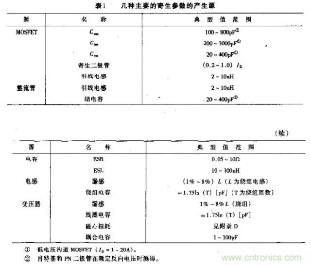 有些寄生參數(shù)已明確定義,如MOSFET的電容,其他一些離散的寄生參數(shù)可以用集中參數(shù)表示,使建模變得更加容易。試圖確定那些沒有明確定義的寄生參數(shù)的值是非常困難的,通常用一個經(jīng)驗值確定,換句話說,在進行軟開關設計時,元器件的選擇以能得到最佳結(jié)果為原則來進行。在線路圖中,合適的地方放置寄生元件非常重要,因為電氣支路只在變換器工作的一部分時間內(nèi)起作用。例如,整流器的結(jié)電容只有在整流器反向偏置時會很大,而當二極管正向偏置時就消失了。表l列出了一些容易確定的寄生參數(shù)和產(chǎn)生這些參數(shù)的元器件,以及這些值的大致范圍。某些特殊的寄生參數(shù)值可以從特定元器件的數(shù)據(jù)資料中獲得。