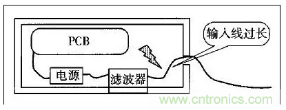 許多設(shè)備的電源線進(jìn)入機箱后,經(jīng)過很長的導(dǎo)線才接到濾波器的輸入端。例如,電源線從機箱后面板輸入,走行到前面板的電源開關(guān),又回到后面板接到濾波器?;蛘邽V波器的安裝位置距離電源線入口較遠(yuǎn),造成引線太長(如圖1所示)。