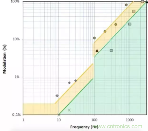電氣和電子工程師協(xié)會(huì)1789-2015年標(biāo)準(zhǔn)首次提出降低人體健康風(fēng)險(xiǎn)的全面建議。上圖顯示的是對(duì)人體健康風(fēng)險(xiǎn)較低或無(wú)明顯風(fēng)險(xiǎn)(綠色部分)的整個(gè)頻率范圍內(nèi)的頻閃限值曲線?! ?/div>