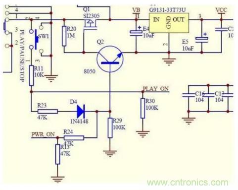圖中電池的正電通過開關S1接到場效應管Q1的2腳源極,由于Q1是一個P溝道管,它的1腳柵極通過R20電阻提供一個正電位電壓,所以不能通電,電壓不能繼續(xù)通過,3v穩(wěn)壓IC輸入腳得不到電壓所以就不能工作不開機!這時,如果我們按下SW1開機按鍵時,正電通過按鍵、R11、R23、D4加到三極管Q2的基極,三極管Q2的基極得到一個正電位,三極管導通(前面講到三極管的時候已經(jīng)講過),由于三極管的發(fā)射極直接接地,三極管Q2導通就相當于Q1的柵極直接接地,加在它上面的通過R20電阻的電壓就直接入了地,Q1的柵極就從高電位變?yōu)榈碗娢?,Q1導通電就從Q1同過加到3v穩(wěn)壓IC的輸入腳,3v穩(wěn)壓IC就是那個U1輸出3v的工作電壓vcc供給主控,主控通過復位清0,讀取固件程序檢測等一系列動作,輸處一個控制電壓到PWR_ON再通過R24、R13分壓送到Q2的基極,保持Q2一直處于導通狀態(tài),即使你松開開機鍵斷開Q1的基極電壓,這時候有主控送來的控制電壓保持著,Q2也就一直能夠處于導通狀態(tài),Q1就能源源不斷的給3v穩(wěn)壓IC提供工作電壓!SW1還同時通過R11、R30兩個電阻的分壓,給主控PLAY ON腳送去時間長短、次數(shù)不同的控制信號,主控通過固件鑒別是播放、暫停、開機、關機而輸出不同的結(jié)果給相應的控制點,以達到不同的工作狀態(tài)!