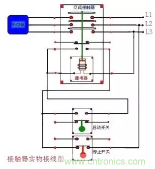 首先電源三相分別接接觸器的主觸點L1,L2,L3,再從接觸器的T1,T2,T3接出三根線接電機的三個接線柱,以上是主電路。