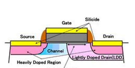 1.“低摻雜漏極”(LDD)區(qū)包圍該晶體管的漏極,并與門極重疊。這一結(jié)構(gòu)既能降低水平擴(kuò)展至漏極的電場,也能降低垂直擴(kuò)展至門極氧氣層的電場,從而增加了擊穿電壓。