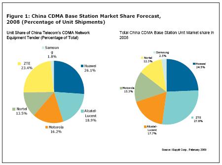 圖1所示為iSuppli公司對(duì)2008年中國電信的CDMA布署B(yǎng)TS市場份額,以及全國CDMA市場的預(yù)測。