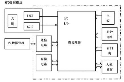 射頻識別系統(tǒng)主要硬件組成是由單片微處理器構成射頻信號的解碼模塊,其主要構成如下框圖,其中通過RS232串行通訊將數(shù)據(jù)交給PC機進行處理。