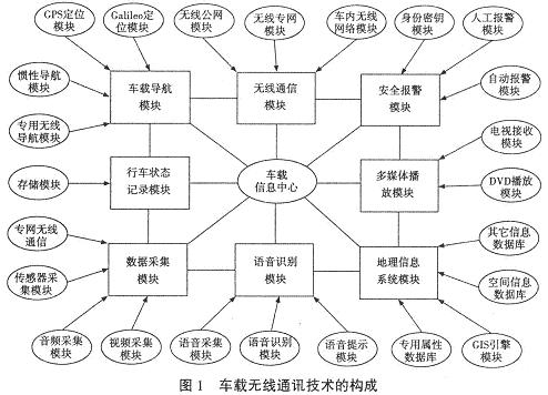 車載無線通訊技術(shù)由車載導(dǎo)航模塊、車載無線通信模塊、安全報(bào)警模塊、行車狀態(tài)記錄模塊、多媒體播放模塊、數(shù)據(jù)采集模塊、語(yǔ)音識(shí)別模塊、地理信息系統(tǒng)模塊八部分組成。所有的數(shù)據(jù)都通過車載信息中心進(jìn)行處理、協(xié)調(diào),并作出正確的反應(yīng)。圖l為車載無線通訊技術(shù)的構(gòu)成。