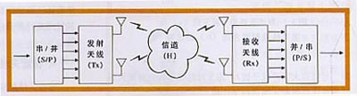 移動(dòng)通信環(huán)境中存在多個(gè)散射體、反射體,在無線通信鏈路的發(fā)射與接收端存在多條傳播路徑,多徑傳播對(duì)通信的有效性與可靠性造成了嚴(yán)重的影響。研究表明,可以利用多徑引起的接收信號(hào)的某些空間特性實(shí)現(xiàn)接收端的信號(hào)分離。多輸入一多輸出(MIMO)技術(shù)在通信鏈路兩端均使用多個(gè)天線,發(fā)端將信源輸出的串行碼流轉(zhuǎn)成多路并行子碼流,分別通過不同的發(fā)射天線陣元同頻、同時(shí)發(fā)送,接收方則利用多徑引起的多個(gè)接收天線上信號(hào)的不相關(guān)性從混合信號(hào)中分離估計(jì)出原始子碼流(見圖4)這相當(dāng)于頻帶資源重復(fù)利用,可以在原有的頻帶內(nèi)實(shí)現(xiàn)高速率的信息傳輸,使頻譜利用率和鏈路可靠性極大的提高。MIMO系統(tǒng)提供分集增益(diversitygain)和復(fù)用增益(multiplexinggain)。