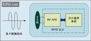 從結構上講,RFID是一個包含射頻模擬前端(RFAFE)和基帶信號處理兩大部分的單片集成電路(見圖1)?;鶐到y(tǒng)包括控制邏輯(甚至微處理器)和必要的存儲器,AFE部分是RFID的能量與信號接口,提供片上基帶系統(tǒng)工作所需的電源和時鐘等輔助信號,完成數(shù)據(jù)的接收與發(fā)送功能。由于RFAFE屏蔽了智能卡片上的電源、時鐘、上電復位(POR)等信號與外界的聯(lián)系,在一定程度上減少了攻擊實施的點,與接觸式智能卡相比在安全性方面有一定的提升。
