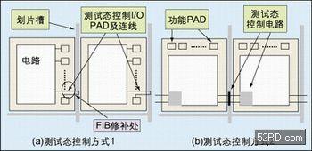 圖5a是在接觸式智能卡芯片的發(fā)展過程中曾大量采用的測試態(tài)控制方式:使用額外的I/O管腳和芯片內部電路相連,該連線通過劃片槽,這樣芯片劃斷后就不能通過簡單控制該管腳進入測試態(tài)。由于FIB修補技術的出現(xiàn),這個手段已經過時。圖5b是最有潛力的替代方案:在劃片槽和鄰近的芯片中設計部分控制電路,從而得到不可逆的測試態(tài)控制手段。