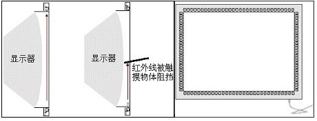 紅外觸摸屏是在緊貼屏幕前密布X、Y方向上的紅外線矩陣,通過不停的掃描是否有紅外線被物體阻擋檢測并定位用戶的觸摸。如下圖所示,這種觸摸屏是在顯示器的前面安裝一個外框,外框里設(shè)計有電路板,從而在屏幕四邊排布紅外發(fā)射管和紅外接收管,一一對應(yīng)形成橫豎交叉的紅外線矩陣。每掃描完一圈,如果所有的紅外對管通達(dá),綠燈亮,表示一切正常。