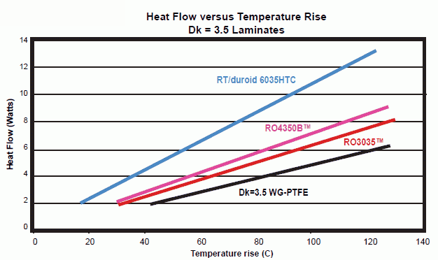 由于很多系統(tǒng)(包括商業(yè)通信和戰(zhàn)術(shù)軍事系統(tǒng))都需要具有高可靠性和穩(wěn)定的電氣性能,電路板材料供應(yīng)商近年來(lái)非常關(guān)注熱管理問(wèn)題,開(kāi)發(fā)出的材料不僅能夠處理類(lèi)似功率放大器等電路中的較高功率級(jí),而且在高溫下不會(huì)發(fā)生電氣性能改變。例如,Rogers Corporation公司最近發(fā)布的RT/duroid 6035HTC電路材料就是一種陶瓷填充PTFE復(fù)合材料,其導(dǎo)熱率高達(dá)1.44 W/m/K,是標(biāo)準(zhǔn)FR-4型電路板材料的好幾倍(見(jiàn)圖1)。這種材料整合了穩(wěn)定的機(jī)械與電氣性能以及導(dǎo)熱性能,因此可作為高頻功率放大器的理想材料。