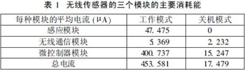 無線傳感器的三個(gè)主要消耗電能的模塊是:感應(yīng)模塊、無線通信模塊和微控制器模塊,如表1所示。這三個(gè)模塊主要有兩個(gè)操作模式:關(guān)機(jī)模式和工作模式。在這兩種模式下分析了每種模塊的功耗,以及總的消耗量。