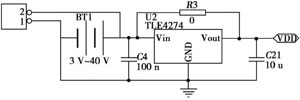 無線傳感器通常的工作電壓范圍為3.0V~3.6V。此次電源設(shè)計(jì)加入了TLFA274穩(wěn)壓器(如圖2所示),可轉(zhuǎn)換3V~40V的電壓,比如通常使用的小型電池或者是汽車電池,給使用者帶來了很大的方便。