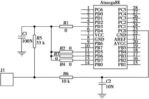 對微控制器芯片選擇Atmel ATmega88,因?yàn)樗哂械凸?,還有待機(jī)模式和主動(dòng)模式的快速轉(zhuǎn)換功能,所以無線傳感器能夠在非常短的時(shí)間完成數(shù)據(jù)的測量和傳輸;它有一個(gè)內(nèi)置的掉電檢測電路,可用來提醒用戶傳感器網(wǎng)絡(luò)電池是否需要更換;它還有一個(gè)內(nèi)置的A/D轉(zhuǎn)換器,可以將傳感器的模擬信號轉(zhuǎn)換成具有10位數(shù)字值的數(shù)字信號(零代表0V,210-1代表電源電壓和最大可能電壓)。
