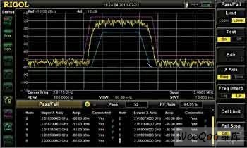 對于問題三可以利用DSA1030A頻譜分析儀中的Pass/Fail功能來解決。用戶根據(jù)實際的需求提前編輯好兩條標準跡線即測量的上限和下限,開啟該功能后會對測量結(jié)果進行統(tǒng)計通過率。在測量失敗的時候會自動停止測量,查看測量失敗的頻率和幅度。如圖3所示,利用Pass/Fail功能監(jiān)控信號的大小。