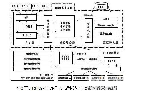 本系統(tǒng)采用B/S架構(gòu),在J2EE開(kāi)發(fā)環(huán)境下,結(jié)合Struts2、Hibernate、Spring、DWR等主流開(kāi)源框架,具有良好的跨平臺(tái)兼容性?;赗FID技術(shù)的汽車(chē)總裝管理系統(tǒng)的軟件架構(gòu)如圖3所示: