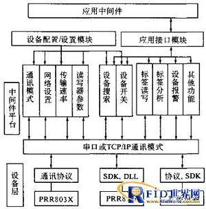 RFID技術(shù)的基本工作原理是:標簽進入磁場后,接收讀寫器發(fā)出的射頻信號,憑借感應電流所獲得的能量發(fā)送出存儲在芯片中的產(chǎn)品信息(Passive Tag,無源標簽或被動標簽),或者主動發(fā)送某一頻率的信號(Active Tag,有源標簽或主動標簽):讀寫器讀取信息并解碼后,送至中央信息系統(tǒng)進行有關(guān)數(shù)據(jù)處理。中間件是介于應用系統(tǒng)和系統(tǒng)軟件之間的一類軟件,它使用系統(tǒng)軟件所提供的基礎(chǔ)服務,銜接網(wǎng)絡(luò)上應用系統(tǒng)的各個部分或不同的應用,以達到資源共享、功能共享的目的.在具體實現(xiàn)上,中間件是一個用API定義的軟件層,具有強大的通信能力和良好的可擴展性。