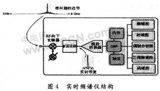 隨著數(shù)字射頻技術(shù)的發(fā)展,要求必須能捕獲并存儲(chǔ)一段時(shí)間的信號(hào),并可反復(fù)回放,分析信號(hào)隨時(shí)間的變化。另外,隨著頻譜利用率不斷提高,干擾將來(lái)自更臨近的頻點(diǎn),甚至同一頻率,這要求頻譜測(cè)試技術(shù)在發(fā)現(xiàn)和捕獲能力上實(shí)現(xiàn)本質(zhì)性的突破。實(shí)時(shí)頻譜儀的核心是基于快速傅里葉(FFT)的儀表,可以實(shí)時(shí)捕獲各種瞬態(tài)信號(hào),同時(shí)在時(shí)域、頻域及調(diào)制域?qū)π盘?hào)進(jìn)行全面分析,滿(mǎn)足現(xiàn)代數(shù)字射頻信號(hào)測(cè)試的需求,圖4所示為簡(jiǎn)化的實(shí)時(shí)頻譜儀結(jié)構(gòu)圖。