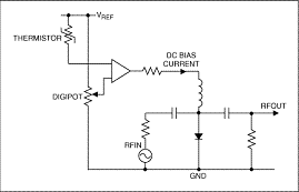 有些系統(tǒng)可能需要進(jìn)行溫度補(bǔ)償(圖3),簡化電路中,數(shù)字電位器IC建立固定或可調(diào)偏置電平,熱敏電阻提供溫度輸入。這兩個(gè)輸入連接到運(yùn)算放大器,產(chǎn)生的輸出通過一個(gè)電阻驅(qū)動(dòng)PIN二極管。