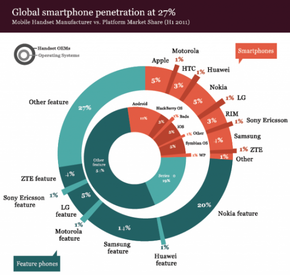 就智能手機(jī)市場領(lǐng)導(dǎo)者而言,當(dāng)前的競爭是在iPhone和Android之間展開的,原因是前手機(jī)行業(yè)領(lǐng)導(dǎo)者諾基亞對iPhone的出現(xiàn)反應(yīng)遲緩,因此在高端智能手機(jī)市場上所占份額正在穩(wěn)步下滑。諾基亞已決定從Symbian系統(tǒng)轉(zhuǎn)向Windows Phone系統(tǒng),這一決定不僅令三星、HTC、摩托羅拉、LG和索尼等Android廠商獲得優(yōu)勢,同時也令華為、中興、宏碁、戴爾和華碩等后來者受益。