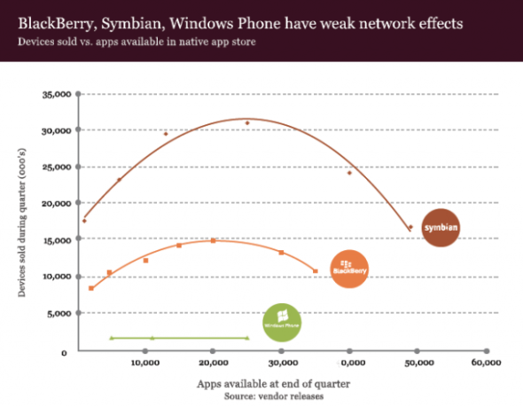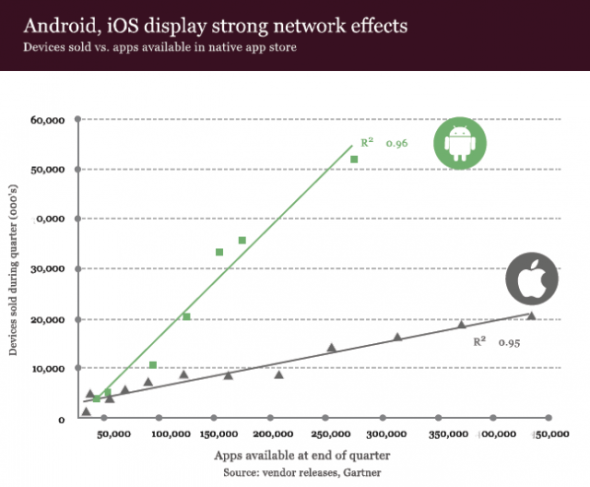 對于未來手機(jī)市場將如何發(fā)展,以及非智能手機(jī)市場將在何時向智能手機(jī)轉(zhuǎn)變等問題,這份報告并未加以猜測,但對于當(dāng)前占據(jù)市場主導(dǎo)地位的從業(yè)者的網(wǎng)絡(luò)效應(yīng)則作出了闡述。報告指出,目前占據(jù)優(yōu)勢地位的智能手機(jī)平臺之所以能取得成功,不光是由于技術(shù)因素,同時也是由于其應(yīng)用生態(tài)系統(tǒng)。50多萬個iOS應(yīng)用和30萬個Android應(yīng)用已令這兩個平臺都達(dá)到了“關(guān)鍵多數(shù)”的水平,而一旦達(dá)到這一水平,那么智能手機(jī)平臺就將開始以指數(shù)方式取得增長。但是,應(yīng)用的數(shù)量并非智能手機(jī)平臺長期健康性的最終衡量標(biāo)準(zhǔn),真正的標(biāo)準(zhǔn)應(yīng)該是開發(fā)者生態(tài)系統(tǒng)的可持續(xù)性。