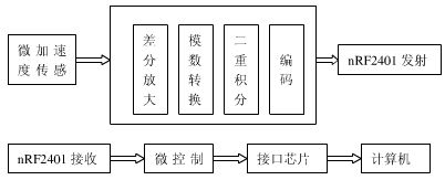 鼠標在人的操縱下移動,微加速度傳感器便會實時地輸出鼠標運動的加速度大小和方向,ADXL203傳感器的量程為±1.7gn ,電壓靈敏度為1000mV/gn,這個電壓信號經(jīng)過差分放大5.0/1.7倍后,通過微控制器A/D轉(zhuǎn)換功能變成與加速度大小對應(yīng)的數(shù)字信號,加速度經(jīng)過兩次積分,便變成了鼠標移動的位移信號,然后,再經(jīng)過編碼,并通過nRF2401射頻收發(fā)器將位移信號發(fā)射出去。