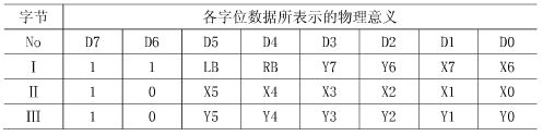 編碼的目的是將X和Y方向的位移改變量,連同鼠標按鍵的實時信息,按照標準的Microsoft鼠標協(xié)議要求的格式進行編碼,以便最后發(fā)送到主機的信息能夠被電腦正確識別,從而使電腦能正確處理發(fā)送給它的位移信號,來正確控制鼠標光標的移動等動作。表1表示的即是標準的鼠標協(xié)議規(guī)定的三字節(jié)數(shù)據(jù)包格式,第1個字節(jié)記錄的是左右按鍵的信息和鼠標X,Y位移的最高2個字位的數(shù)據(jù),按鍵按下時,對應(yīng)的位置1,否則,置0;第2和第3個字節(jié)分別記錄X和Y方向位移的低6位數(shù)據(jù)。位移值的范圍取-127~+127,再大的位移改變量會自動溢出。