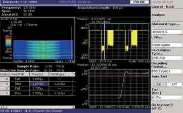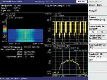 政府規(guī)定要求控制發(fā)射信號的功率、頻率、帶寬。這些規(guī)定防止有害干擾并保證每個發(fā)射者都是頻帶內(nèi)其他用戶的友好鄰居。對于許多頻譜分析儀特別是通常用于脈沖信號能量測量的掃頻頻譜分析儀,進行此類測量是具有挑戰(zhàn)性的。RTSA 能夠分析一個完整的分組發(fā)射過程的能量特點,也能直接測量跳頻信號的載波頻率,而無需將信號置于一個跨度的中心。按一下按鍵,分析儀就能識別一個瞬時 RFID 信號的調(diào)制方式并能夠?qū)β?、頻率和帶寬進行監(jiān)管測量,使預(yù)一致性(pre-compliance)測試過程變得非常靈活和方便 [參閱圖2]。預(yù)一致性測試有助于確保產(chǎn)品一次通過一致性測試,而無需重新設(shè)計和重新測試。