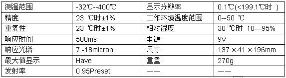 紅外測溫儀是通過接收目標(biāo)物體發(fā)射、反射和傳導(dǎo)的能量來測量其表面溫度。測溫儀內(nèi)的探測元件將采集的能量信息輸送到微處理器中進(jìn)行處理,然后轉(zhuǎn)換成溫度讀數(shù)顯示。在帶激光瞄準(zhǔn)器的型號中,激光瞄準(zhǔn)器只做瞄準(zhǔn)使用。其性能說明下表。