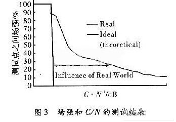 場測結(jié)果有兩種紀(jì)錄方法,一種是記錄各測試點(diǎn)的場強(qiáng)相對于該區(qū)域場強(qiáng)門限的百分比,對于不同的點(diǎn),又分為兩種情況。如果在接收邊緣區(qū)域,場強(qiáng)門限(Elim)定義為:Elim=Erec-M,se M>0 dB,如果不在邊緣區(qū)域,則Elim>Erec,se M=0 dB。另一種記錄方法是記錄各測試點(diǎn)的場強(qiáng)相對于接收門限信噪比的百分比,如圖3所示。