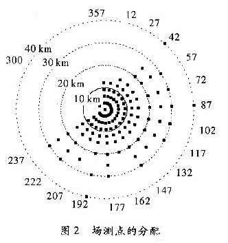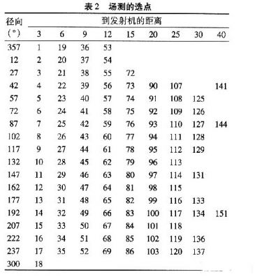 覆蓋測試是根據(jù)特定的半徑和幅角在圓周上進(jìn)行選點(diǎn)的,這些測試點(diǎn)的選擇總共包含18個不同幅角(12,27,42,58,72,87,102,117,132,147,162,177,182,207,222,287,300,357),對應(yīng)于以發(fā)射機(jī)為圓心的3,6,9,12,15,20,25,30和40 km這幾個半徑上。選點(diǎn)是出于幅角的考慮,展現(xiàn)了至少45 dBμV/m內(nèi)的場強(qiáng)估計,并根據(jù)地形信息通過算法得到有用信息。圖2展示了場測選點(diǎn)的地形分配,測試點(diǎn)的具體參數(shù),如表2所示。