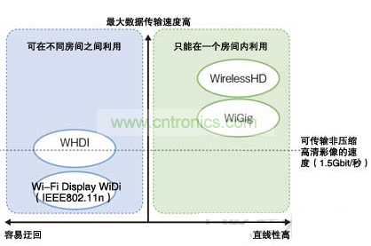 Wi-Fi Display、WiDi和WHDI因電波比較容易迂回,適用于在不同房間的連接,采用60GHz頻帶毫米波的WirelessHD和WiGig雖然可以確保傳輸速度,但如果有障礙物的話(huà),電波難以到達(dá),因此主要在一個(gè)房間內(nèi)使用。
