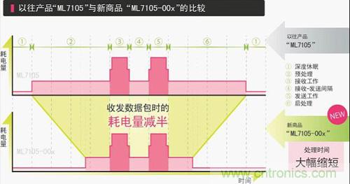 LAPIS Semiconductor去年推出的“ML7105”,實現(xiàn)了業(yè)界頂級的低耗電量(收發(fā)數(shù)據(jù)包時的運行狀態(tài))。此次開發(fā)出的新品“ML7105-00x”,不僅保持了運行狀態(tài)下的低耗電量性能,而且平均電流還減少了一半。所謂平均電流,是指按一定間隔反復收發(fā)數(shù)據(jù)包時的運行狀態(tài)(耗電量大)與休眠狀態(tài)(耗電量小)的平均電流值。通過大幅減少改變狀態(tài)所需的時間,使平均電流減半,從而使電池壽命可達2倍。因此,按LAPIS Semiconductor的工況條件,支持Bluetooth® Low Energy的、使用紐扣電池(CR2032)的設(shè)備其電池壽命即使在24小時連續(xù)工作的條件下,也可充分使用2年。